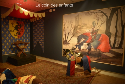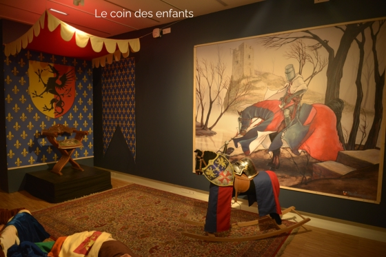 Scénographie d’une exposition sur le thème de la mode de la fin du Moyen Âge et des armures de chevaliers présentée au château d’Hardelot (Conseil départemental du Pas-de-Calais) en 2019. Les costumes présentés sont de Nathalie HARRAN La Dame d’Atours. La salle dédiée aux expositions temporaires est haute et étroite. Elle se termine par un grand dégagement en pointe. Un important escalier mène à une mezzanine. C’est un espace difficile à mettre en scène car les murs et les plafonds ne comportent pas d’angles droits.Pour créer un ambiance, de grandes bannières héraldiques sont suspendues du plafond dans sa partie la plus longue. Ainsi, les visiteurs devant obligatoirement emprunter l’escalier ne pouvaient découvrir l’exposition d’un seul coup d’œil. Une ligne de blasons faisant écho aux bannières délimitent la partie armures. L’espace en pointe est utilisé pour présenter les habits de cour. Un décor est tendu en travers de la salle afin d’en masquer le fond. De grands visuels de fenêtres reçoivent un éclairage cadré sur les ouvertures afin de donner l’illusion d’un éclairage extérieur, donnant ainsi vie à l’ensemble. Sous l’escalier, une échoppe médiévale est installé. Un coin pour les enfant est aménagé avec une malle à costumes, un trône sous un dais, un cheval à bascule avec un casque, un bouclier et une épée.